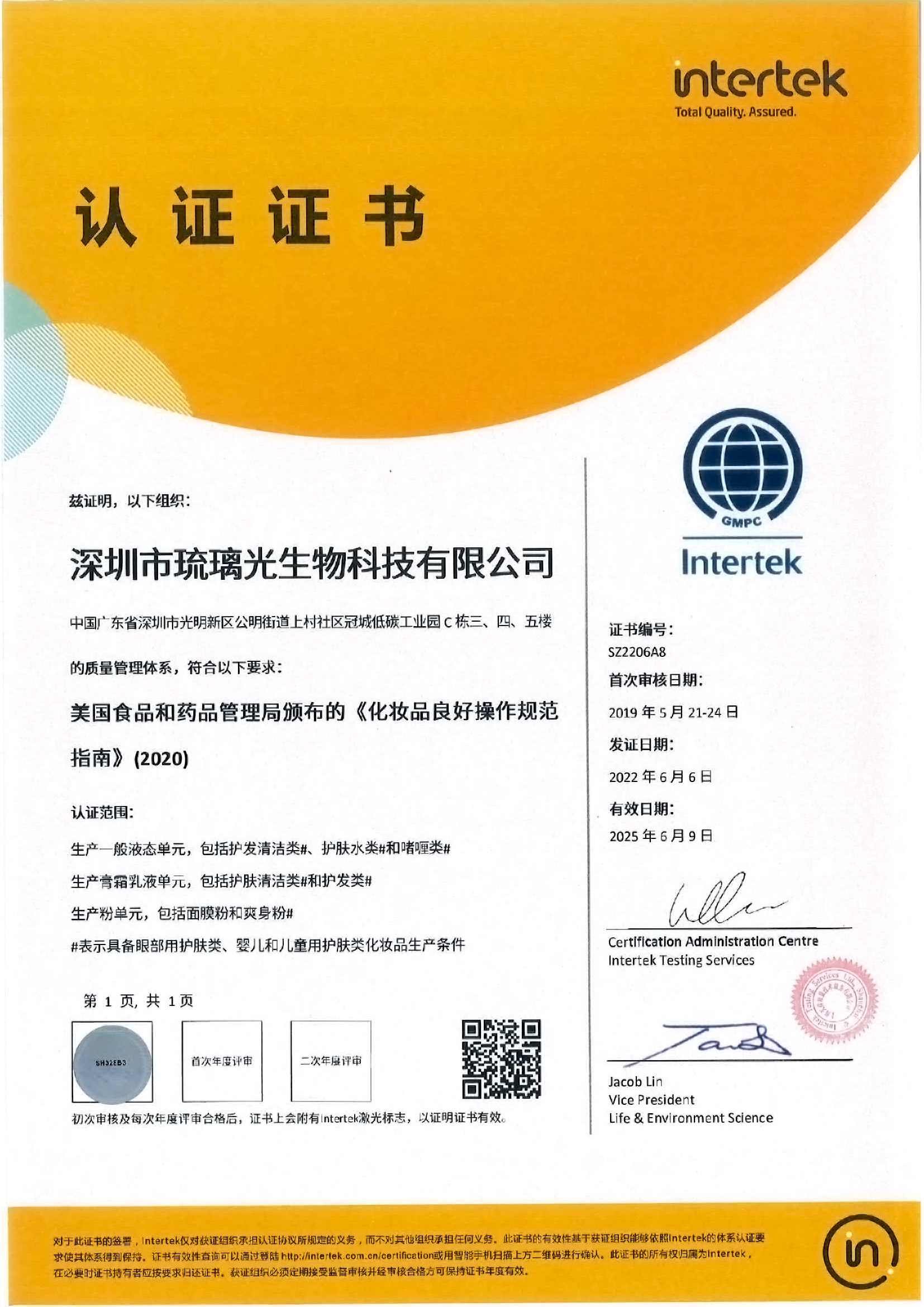 美國GMPC認證證書中文SZ1906B4